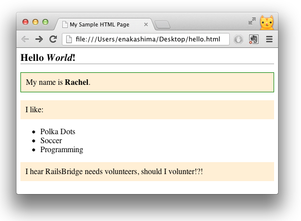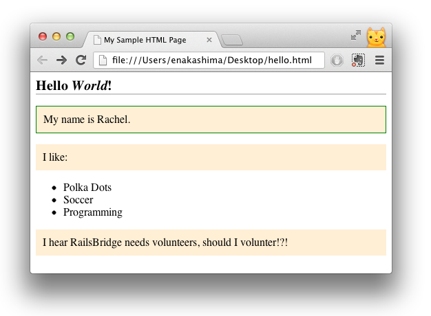 <h1>Hello <em>World</em>!</h1> <p class="special">My name is Rachel.</p> <p>I like:</p> <ul> <li>Polka Dots</li> <li>Soccer</li> <li>Programming</li> </ul> <p>I hear RailsBridge needs volunteers, should I volunteer!?!</p>Step 3