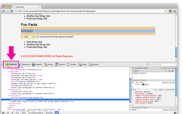 Clicking on an HTML tag in the elements panel will highlight that element in the browser window. It's a great tool for debugging styling problems. On the right side of the panel, you'll even get a list of styles that are being applied to that element.