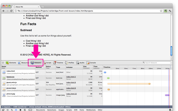 If you click on a file name, you can take a look at the contents of that file. This panel is a great place for debugging script linking or loading issues. (You can see HTTP headers and request params here too, with a little digging.)