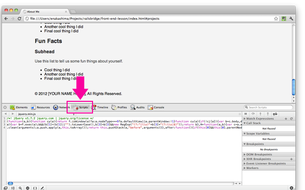 The 'Sources' panel is another JavaScript pro tool. If you're used to working with an IDE that has a debugger, you'll be able to use many of the same techniques (like breakpoints, stack traces, and watch expressions) right here in the browser.
